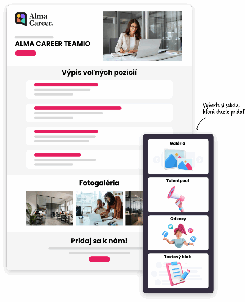 Vyskladajte si kariérne stránky na mieru a do 10 minút. Vďaka jednoduchému postupu si obsah nahráte sami bez potreby programovania a môžete ho kedykoľvek upraviť.